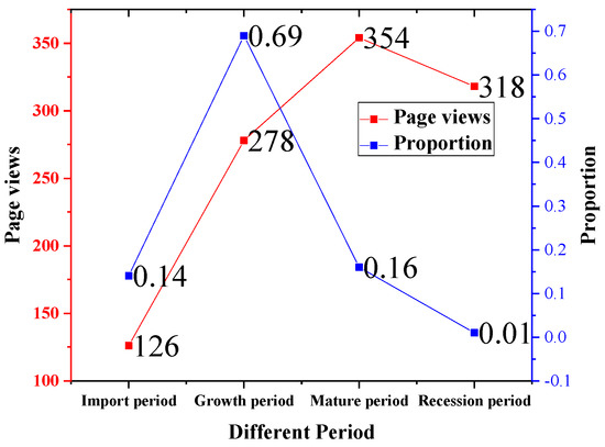 The results of green production management and innovation of technology-based SMEs are analyzed and shown in Figure 5. In Figure 5, among the 119 companies surveyed, 14% are in the introduction stage, 69% are in the growth stage, and 16% are in the mature stage. It was found that most of the technology-based SMEs surveyed are in the growth stage, and the enterprises are still vigorous. In the figure, the number of page views of SMEs in different periods is different. The page views in the introduction period are 126, in the growth period are 278, in the mature period are 354, and in the decline period are 318.