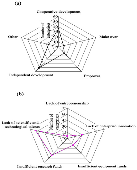 The analysis of the enterprise’s internal green production management and innovation is portrayed in Figure 7, which shows that 51 major enterprises transform their technologies through independent development in enterprise technology transformation methods. In addition, 36 companies changed their technologies through cooperative development, and 15 companies transformed their technologies through authorization. Only eight companies have converted their technologies through transfer. The results of the above data indicate that the technology-based SMEs in Zhejiang Province mainly transform their technologies through independent and cooperative development when they conduct internal green production management and innovation. Further analysis of obstacles shows that the lack of scientific and technological talents and insufficient research funds are the obstacles facing most technology-based SMEs to carry out internal green production management and innovation. Miao et al. [19] proposed that collaborative innovation should be strengthened. Talent is the most difficult heterogeneous asset to navigate and define. It is necessary to boldly implement a high-level talent mutual recruitment plan between industries, universities, and research institutions and activate intellectual property rights development. Cooperation between enterprises, universities, and research institutes must be strengthened via technical research cooperation, sharing scientific and technological equipment, theoretical research, and other diversified cooperation methods. The government plays a leading role in promoting and regulating the effectiveness of resource allocation.