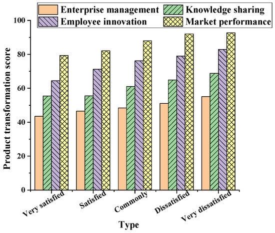The results of green production management and innovation based on support from government agencies are portrayed in Figure 8. From Figure 8, it is apparent that the score of product transformation that is not satisfied with enterprise management is 48, while the score of product transformation that is very satisfied with enterprise management is only 42. In addition, most people rate the market performance of enterprise products as very satisfactory. In the score proportion of employee innovation projects, the difference between the scores of dissatisfied and very dissatisfied is small, indicating that most employees hope the enterprise will strengthen innovation support for green production management.