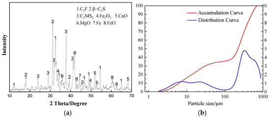 XRD pattern and particle size distribution of the steel slag. (a) XRD pattern of the steel slg. (b) Particle size distribution of steel slag.