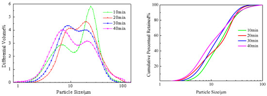 The grinding time was controlled at 10 min, 20 min, 30 min, and 40 min by the ball mill. After grinding, the particle size distribution of steel slag was measured by a laser particle size analyzer, and the results are shown in Table 3 and Figure 2.