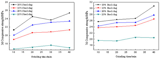 Second, the strength experiments of steel slag replacing cement were conducted with different particle sizes of steel slag powder. Where the water-cement ratio is 0.4, the doping of steel slag powder is 10%, 15%, 20%, and 25%, and the sample size is 40 mm × 40 mm × 160 mm [23]. In standard maintenance conditions up to 3 and 7d, the best grinding time for steel slag can be obtained.