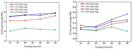 It can be seen from Figure 4 that under the condition of the same steel slag admixture, with an increase in grinding time, the change curves of 3d and 7d flexural strength are relatively flat. Under the same grinding time conditions, the flexural strength gradually decreases with an increase of steel slag admixture. Comprehensive 3d, 7d compressive strength and flexural strength change law and improve the utilization rate of steel slag, the best grinding time is for 20 min, with steel slag dosing of 10%.
