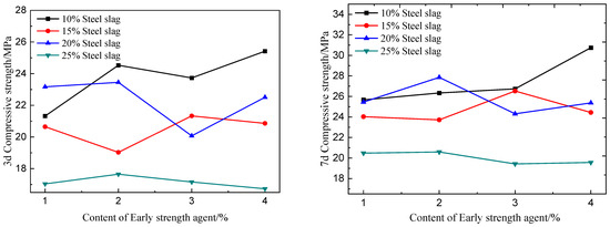 It can be seen from Figure 5 that under the condition of different steel slag content ratios, the compressive strength at the age of 3d and 7d fluctuates significantly with the change of early-strengthening agent. When the content of steel slag is 10%, the strength shows a gradual increase with the content of the early strong agent, and the compressive strength increases more significantly in the range of 1–2% of early strength agent. With steel slag dosing at 15%, the strength shows a changing trend, the content of early strong agent first decreases and then increases, and the compressive strength reaches the maximum when the amount of early strength agent is 3%. When the content of steel slag is 20% and 25%, the strength shows a changing trend, the content of early strong agent first increases and then decreases, and the compressive strength reaches the maximum when the amount of early strength agent is 2%. At the same early strength agent dosing, the more steel slag dosing, the lower the 3d and 7d compressive strength. This shows that for the active excitation effect, there is an optimal ratio of steel slag dosing and early strength agent. When the steel slag content is within a specific range, the excitation effect of the early strength agent is better with the increase of the doping amount. When the steel slag content is beyond a specific range, the excitation effect of the early strength agent is not obvious. Because the early strength agent contains more SO42−, it promotes the chemical reaction of calcium aluminate in the slurry to produce more ettringite, and improves the strength of the system [25].