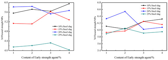 It can be seen from Figure 6 that under the condition of the same steel slag admixture, with an increase of early strength agent, the 3d and 7d flexural strength curve showed a trend of rising and then falling. When the content of early strength agent is 2% and steel slag is 20%, the maximum flexural strength of 3d and 7d is 5.84 MPa and 6.54 MPa. Under the same grinding time conditions, the flexural strength gradually decreases with an increase of steel slag admixture. For the combined 3d and 7d compressive strength and flexural strength, the best effect is achieved when the content of early strength agent is 2% and steel slag is 20%.