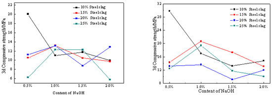 It can be seen from Figure 7 that when the steel slag content is 10%, the compressive strength of 3d and 7d gradually decreases with an increase in NaOH content, and the maximum compressive strength at 3d and 7d when NaOH dosing is 0.5%. At the proportions of 15%, 20%, and 25% steel slag content, the 3d and 7d compressive strength increases first and then decreases with the content of NaOH, and the 3d and 7d compressive strength was at its maximum at 1.0% NaOH dosing. In the same NaOH dosing, the more steel slag dosing, the lower the 3d and 7d compressive strength. This indicates that NaOH has a pronounced stimulating effect on the activity of steel slag when the content of steel slag is significant. This is because the addition of NaOH increases the alkalinity of slurry and promotes the depolymerization of the vitreous body in steel slag. More C-S-H gels and ettringites are generated in the system, which cross and lap with each other to form a network structure, promoting the improvement of strength [26].