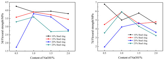 It can be seen from Figure 8 that when the steel slag content is 10%, the flexural strength at 3d and 7d slowly decreases with an increase of NaOH content, and the maximum flexural strength at 3d and 7d when NaOH dosing is 0.5%. At the proportions of 15%, 20%, and 25% steel slag content, the 3d and 7d flexural strength increases sharply and then decreases slowly. When the steel slag dosing is 15% and NaOH is 1.0%, the 3d flexural strength obtains its maximum. When the steel slag dosing is 25% and NaOH is 1.0%, the 7d flexural strength reaches its maximum. For comprehensive 3d and 7d compressive strength and flexural strength, the optimum NaOH content, and steel slag content are 1.0% and 25%, respectively.