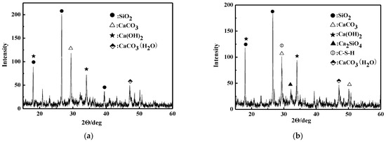 After the standard curing for 3d and 7d, appropriate samples were prepared and dried, and ground to powder for the XRD test. The test results are shown in Figure 9, where the curing time in Figure 9a is 3d and in Figure 9b is 7d.