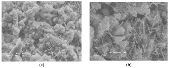 The microstructure diagram of cement hydration products replaced by steel slag was obtained by scanning electron microscopy (SEM), as shown in Figure 10, where the curing time in Figure 10a is 3d and that in Figure 10b is 7d.