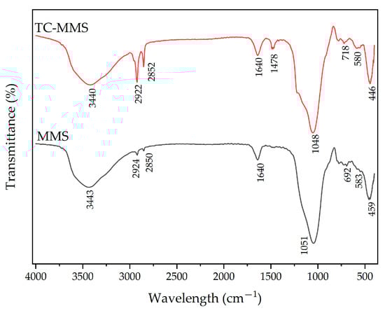 The FT-IR peaks of the MMS before and after adsorption of TC were collected in the range from 400 to 4000 cm−1 (Figure 1), indicating the chemical bonds and functional groups in the compound. The O–H stretching vibration was identified as the source of the big broadband at 3440 to 3443 cm−1. The absorption peaks at 1640 cm−1 were caused by the symmetric and asymmetric bending vibration of C=O. Fe–O stretching was assigned to the band below 700 cm−1. The characteristic absorption bands of the sample at 692 and 583 cm−1 were assigned to iron(II) oxide bending, and the band at 459 to 446 cm−1 was ascribed to the bending vibration mode of Fe2O3. The band at 1048 cm−1 to 1051 cm−1, which is associated with Si-O-Si antisymmetric stretching vibrations, is a sign that silicon dioxide is present in the sample. The bands at 579 and 583 cm−1 are also an indication of the presence of Si–O–Fe [45]. Most of the adsorbent’s peaks remained constant after TC adsorption, revealing that the adsorption procedure did not modify the structure of material. However, several distinctive peaks at 1478, 2852, and 2922 cm−1 were characteristic peaks of the C=C skeleton and C-H stretching vibration of CH2 and CH3 induced by aromatic groups of TC [46,47]. The FT-IR spectrum proved that TC was adsorbed onto the adsorbent and the sample’s structure is mostly stable after adsorption [48].