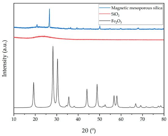 Comparisons with those of SiO2 (extracted from biomass power plant Ash) and Fe2O3 peak [49] are shown in Figure 2. The XRD pattern of the MMS exhibited the characteristic diffraction peaks of Fe2O3 with weak intensity due to the lower concentration of Fe2O3. In addition, the relatively slightly broad peak observed at 15−30° arose from the SiO2, demonstrating that the crystalline structure of the iron oxide was retained after the encapsulation in silica.
