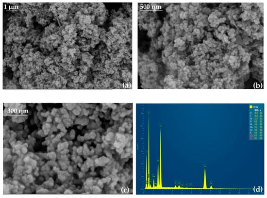 SEM images of MMS (a–c), and EDS curve of MMS (d).