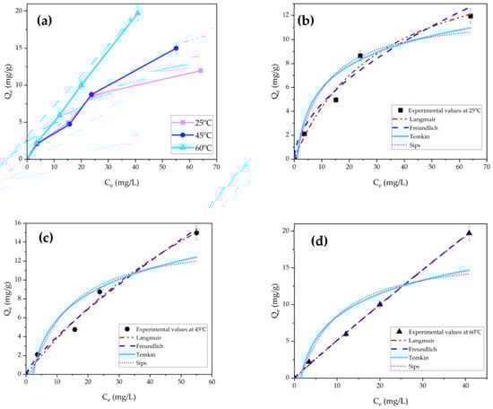 In order to elucidate the interactions between the adsorption ability of the MMS and TC in solution at adsorption equilibrium, the data were modeled using four adsorption isotherms, including Langmuir, Freundlich, Temkin, and Sips isotherm models at 25, 45, and 60 °C. The isotherm models were listed below with Equations (3)–(6) as follows.