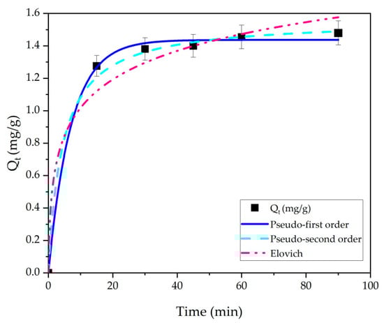 The adsorption kinetics explained the impact of time and temperature on the TC adsorption rate. The adsorption kinetics test was conducted by adding 0.03 g of adsorbent to 10 mL of 100 mg/L TC solution at 45 °C. The adsorption data were fitted using three popular kinetic models, including the pseudo-first-order, pseudo-second-order, and Elovich models. The kinetic models are listed in the Equations (9)–(11) respectively, the corresponding nonlinear curves are shown in Figure 5, and Table 3 contains the estimated and shown kinetic parameters.