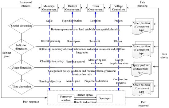 (1) Balance of interests and path planning among governments at all levels. It mainly refers to the optimal game strategy of interest balance among the municipal government, district (county) government, township (sub-district) government and village committee. Based on this, the development path planning of construction land decrement is established to clarify specific plans in the types and spatial locations of construction land decrement, index trading platform and trading mechanism, planning and control of reduction use, and timing arrangement of decrement implementation.
