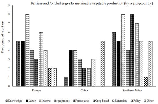 The barriers or constraints related to the adoption decision have been widely summarized, including by Adnan and colleagues [149]. These broader drivers of adoption manifest as various reasons for the adoption or non-adoption of various technologies. The barriers to sustainable vegetable production were categorized into: lack of knowledge, labor demand, income-related factors (equipment maintenance cost and lack of access to credit), equipment, farm status (size and tenure), crop-based factors (yield and seed access), lack of extension support and enabling policy. Figure 2 shows the frequency of references to these barriers from the reviewed articles. Labor, income needs and crop-related factors are common across the three regions. Overall, studies about China report the fewest barriers, whereas southern Africa reports the most. Farm size is the most often mentioned barrier to the adoption of sustainable vegetable production in Africa. Of interest is the lack of policy challenges in sustainable vegetable agriculture in China. This could mean it is not an issue in vegetable production, but it could be an issue when it comes to the production of other crops.