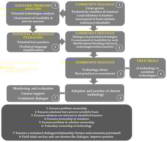 Farmer-centered framework for sustainable agriculture practice dissemination: One of the reasons for challenges to adoption is inherent in the way technologies are introduced to farming communities. A technology that clearly solves a farmer’s “accepted” problem should be easily adopted. We argue that the discussed challenges to adoption (and consequent dis-adoption) are indicative of gray areas in the approach to technology dissemination. One possible scenario is where farming communities are “sold” a technology, usually with glorified outcomes, without farmer input of what challenge the technology intends to address. It is thus key that communities play a key role in deciding which technology could suit their agroecological circumstances. Emphasizing the lack of community dialog regarding drip irrigation technology in Burkina Faso, Gross and Jaubert [144] state: “Information is generally lacking as to who are smallholders, and what are their needs and constraints, yet development organizations devote little attention to answering these questions in their areas of intervention”. Sulifoa et al. [196] report on community rejection of the imposed Mucuna pruriens as a cover crop (in conservation agriculture) by locals who instead preferred the local crop, Erythrina variegata. These examples highlight the importance of collective problem identification and solution co-creation. Recognition by technology promoters of existing local technologies, an understanding of the key and “accepted” silvicultural problems and the selection of suitable crops for specific interventions should ensure active farmer involvement. In Figure 3, a suggested eight-step framework for sustainable agriculture practice dissemination is shown, where the extension–farmer dialog takes a central role.