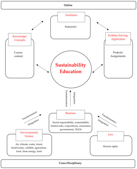 Based on the effectiveness of the course, a Model for a Cross-Disciplinary Asynchronous Online Course in Sustainability Education is proposed (see Figure 1). The cross-disciplinary course concepts are environmental science, law, and business. The components of an environmental science—air, climate, water, forest, biodiversity, wildlife, agriculture, food, alternative clean energy, and fuel—and law curriculum—human rights—are transformed and integrated through the lens of business, relating specifically to social responsibility; the roles of corporations, consumers, government, and NGOs; and sustainability practices for sustainability education in the entrepreneurship curriculum. In terms of the online delivery, students integrate the knowledge and course contents with the support of the instructor; this frequently follows a circular system through discussion posts and journal feedback in which questions are asked and students return to their original thinking. They then apply these concepts to solve complex problems concerning sustainability. The instructor plays a role as a facilitator in the online course to maximize student learning.