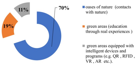 The second most important for the respondents is the implementation of educational, entertainment, and sports functions on the territory of the city parks. This is explained by the fact that these cities have a rather high level of development of social infrastructure in general. The megatrend for digitalization also influences sensory gardens and, in many cases, the use of QR-code technology in a sensory garden as a study tool has become popular [45]. This example is highly implemented in the VDNH park in Moscow.