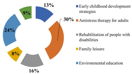 The second most important function is the rehabilitation of people (24%). In general, the anti-stress and rehabilitation orientation of sensory gardens occupies more than 50% of the respondents’ preferences and is dominant in their priorities.