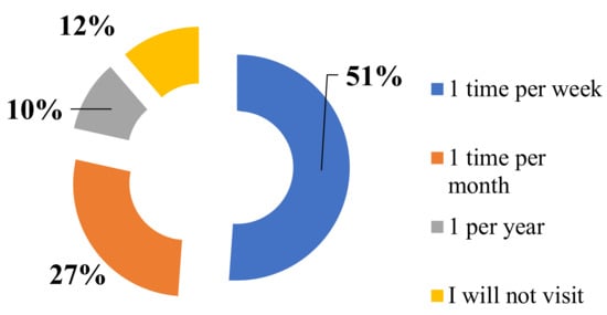 As can be seen from Figure 4 (Q5), more than 51% of the respondents, if they live within walking distance (15 min), could and would like to visit a sensory garden at least once a week. Another 27% of respondents are ready to visit a sensory garden at least once a month. Thus, almost 80% of the respondents are interested in having a sensory garden in the zone of the nearest walking distance.