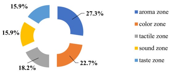 The results of the survey show that aroma and colors zones are a priority for citizens, 27.2% and 22.7% of respondents (see Figure 5). Therefore, an ordinary sensory garden could be zoned only by different smell and color zones formed by different flowers and grasses, including the smell effect of waterfalls. The general influence of environment design was proved in the monograph of Lee, where she also pointed at the important influence of the environment on humans, especially smell and color [38]. Spence in (2020) researched sensor zones, namely the architectural design for the multisensory mind and five main human senses in which he believed our attention to be captured by the various senses. According to Spence research rankings: vision, 70%; audition, 20%; olfaction, 5%; touch, 4%; and taste, 1%” [36].