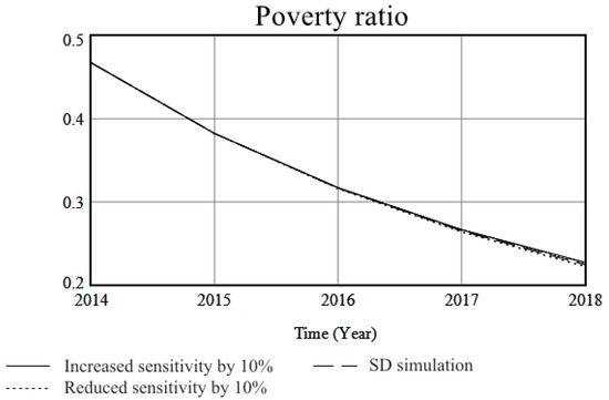 The sensitivity test is an assessment of confidence in the stability of the model. The commonly used structural analysis evaluates the reliability and accuracy of the SD model by increasing or decreasing the parameters of multiple variables by 10% per year [48,53]. A good model is insensitive to changes in variable parameters. We increase and decrease the parameters of the variables in the model (i.e., variations in the value of other farming output, the total value of industrial output, fixed asset investment, and per capita income) by 10% from 2014 to 2018 to investigate whether these adjustments will cause significant fluctuations in the incidence of poverty. If the fluctuations are large, the model sensitivity is poor, and the model is unstable. The results show that the error of poverty incidence in the SD model is within 0.01 when the model variable parameters are increased and decreased by 10%, indicating that changes in the variable parameters do not have a significant effect on the poverty incidence in the SD model, and its variation is minimal. As a result, the model has credibility and stability (Figure 2).