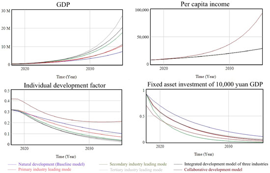 With the exception of the natural development model, all other models achieved GDP growth. In particular, the total GDP growth of the second- and third-leading industry modes and their integration modes is about twice that of the other two modes. The reason for this phenomenon is the benefits of scale adjustment in developing a single industry. In comparison, although the total GDP produced by the primary industry leading mode and the collaborative development mode is small, it shows an overall upward trend and roughly similar movements.