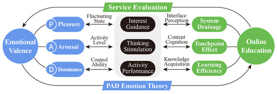 The association between emotional valence and online education services is depicted in Figure 1. On the one hand, the experience of online education services demonstrates that interest guidance, thinking stimulation, and activity performance are significant aspects that influence the learning emotions of users [24]. It develops a correlative link with the three aspects of the PAD emotion theory, which are influenced by the user’s emotional ups and downs, level of cognitive activity, and capacity for information control. In contrast, system drainage, touchpoint effect, and learning efficiency are the primary indicators of online education service evaluation, which are interrelated with interest guidance, thinking stimulation, and activity performance via interface perception, content cognition, and knowledge acquisition. This demonstrates that user emotional valence can be incorporated into the evaluation of online education services.