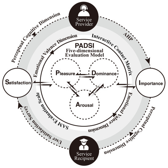 Based on the correlation between user emotional valence and online education service evaluation, user emotional pleasure, activation, and dominance are included in the online education service evaluation index system as the dimension of emotional valence. At the same time, by analogy to the traditional service evaluation method, user satisfaction and important indicators are selected as perceptual cognitive dimensions to jointly construct the PADSI five-dimensional evaluation model, as shown in Figure 2. The emotional valence dimension can be broken down as follows: the user’s level of emotional pleasure represents the extent to which students are engaged in and benefit from their online learning experiences; the level of arousal represents the effectiveness with which students apply their imagination and initiative to their online coursework; and the level of dominance represents the extent to which students accept and internalize what they learn. In the realm of perceptual cognition, touchpoint importance indicates the logic and necessity of a certain function, while user satisfaction indicates the degree to which students’ requirements are met by the online education platform.