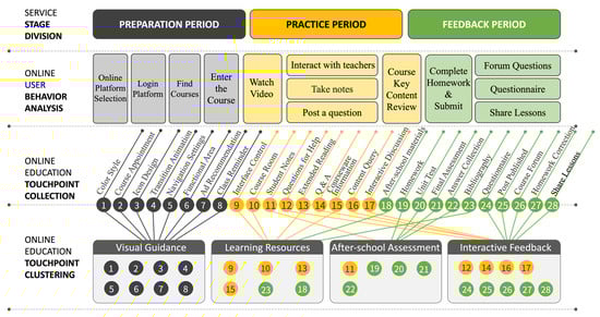 Figure 4 displays the interactive touchpoint matrix of the online education platform, which consists of four modules: stage division, behavior analysis, touchpoint collection, and touchpoint clustering. First, based on the overall service process and user behavior experience process, the online education service stage is divided into platform drainage, knowledge learning, and service expansion. Secondly, the research object is transitioned from user behavior to service touchpoints, and the corresponding service touchpoints are obtained according to the user experience process. Lastly, based on the interactive characteristics of the online education system, the service touchpoints are divided into four categories: visual guidance, learning resources, after-class evaluation, and interactive feedback, providing a basis for the construction of the service evaluation index system.