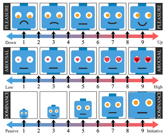 - Design of emotional evaluation questionnaire. To enhance the readability and effectiveness of the questionnaire, the SAM image emotion scale was introduced to evaluate user emotions. The SAM scale presents the pleasure, activation, and dominance of the user’s emotions in the form of images and focuses more on the subject’s feeling and perception of emotional reactions, thereby helping the subject to evaluate their own emotions more rapidly and intuitively, as depicted in Figure 5.