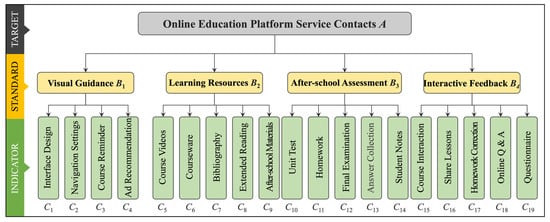In accordance with the model in Figure 2, we deconstruct the online education service system as follow: use the interactive contact matrix to convert the service contact into service evaluation indicators and use the SAM scale to evaluate the user’s emotional pleasure, activation, and dominance in the online learning process. Simultaneously, user satisfaction surveys and analytic hierarchy methods are utilized to evaluate the importance and satisfaction of user groups with the online education service system.