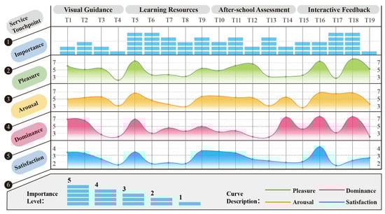 - Results of evaluation and optimization strategies. We summarize and evaluate the evaluation data to visualize the evaluation outcomes. Meanwhile, utilizing the collected data, a detailed analysis of the corresponding service touchpoints is conducted. We explore the relationships among user emotional valence, satisfaction, and importance using single-factor analysis, comparative evaluation, and inductive analysis to propose effective iterative strategies and optimization directions for the current online education system to enhance the learning experience and efficiency.