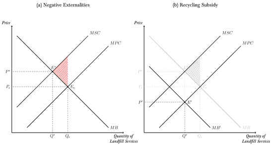 An alternative solution to a tax, and a common policy in many countries, is to subsidize recycling services. Recycling is a substitute for landfill services. A subsidy lowers the relative price of recycling to landfill services, leading to more waste being recycled and less thrown into landfills (For recent studies comparing waste taxation and recycling subsidy regimes, see Helm et al. [40] and Hua et al. [41]). The effect a recycling subsidy has on the market for landfills is shown in Panel (b) of Figure 1. The demand, or marginal benefit, for landfill services falls because the price of recycling has fallen with the subsidy. The new equilibrium is at (Although the socially optimal quantity from the original graph in Panel (a) is reached, this is not the new socially optimal quantity with the subsidy included). Even though there still exists dead-weight loss in this market because , the quantity is the same as that reached at equilibrium , the intersection of and . Through the subsidy for recycling, the original optimal quantity of landfill services in the market without the subsidy is reached (For a similar analysis on the economics of recycling subsidies, see [42] (pp. 486–487)).
