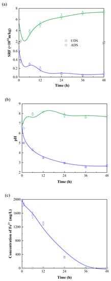 Profiles of SRF (a), pH (b), and Fe2+ concentration (c) in sludge during 48 h of bioleaching with UDS and ADS.