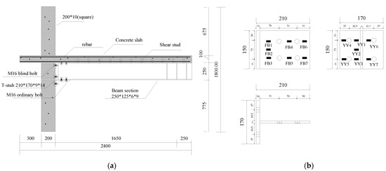 At present, there are three problems in the research on most semi-rigid joints. First, steel columns are mostly H-shaped and the research on steel columns with closed sections, such as square steel-tube columns, is less developed. When faced with steel columns with closed sections, such as square steel-tube columns [4], it is necessary to weld or install hand holes on the column wall, which greatly reduces the construction efficiency. Furthermore, the welding quality is difficult to ensure, as it is affected by many factors and the seismic performance of the joints is uneven [5]. In recent years, the defects caused by welding have been overcome with the development of unilateral high-strength bolts [1]. Blind high-strength bolts only need to be installed from one side, which is convenient for construction and solves the problem that ordinary high-strength bolts are difficult to apply to closed sections, such as square steel-pipe columns. A second problem is that, in the selection of connectors, domestic and foreign scholars seem to prefer to use end-plate connections [6] and the research on the use of T-shaped steel as the connector is relatively undeveloped. Finally, most of the tests did not consider the combined effect of concrete floor slabs. As the main load-bearing member, the reinforcement in the slab has a great impact on the seismic performance of the joint [3].