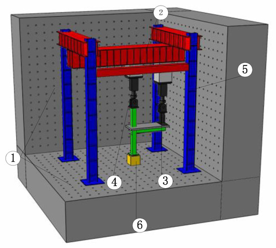 Test model. Note. 1. Rigid foundation and reaction wall; 2. beam of reaction frame; 3. hydraulic servo actuator of 1000 kN capacity; 4. hydraulic servo actuator of 2000 kN capacity; 5. column of reaction frame; 6. unidirectional hinge support.