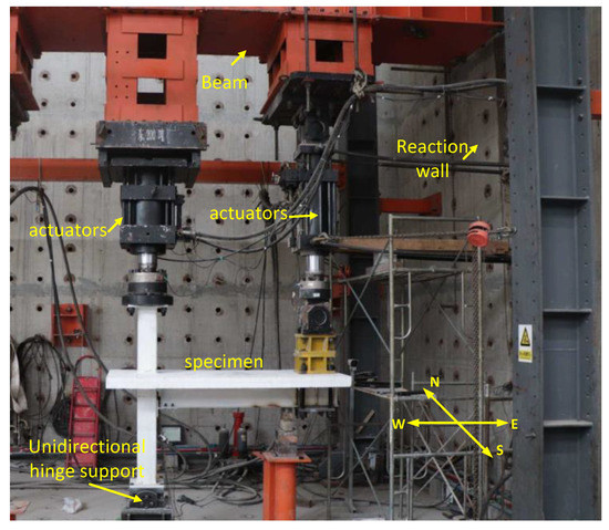 The schematic diagram of the test model and the loading site are shown in Figure 2 and Figure 3, respectively. The bottom of the square steel-tube column of the specimen was connected with unidirectional hinge support; in turn, the hinge support was connected to the rigid ground through anchor bolts. The top of the column and the end of the beam connected with the 2000-kilonewton hydraulic servo actuator and the 1000-kilonewton hydraulic servo actuator, respectively. During the loading test, the hydraulic servo actuator, with a capacity of 2000 kN, was arranged to apply vertical load with an axial compression ratio of 0.25, which remained constant throughout the test. The hydraulic servo actuator, with a capacity of 1000 kN, was used to apply the load to each beam end in the vertical direction.