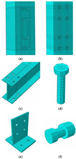 The mesh design used the symmetry of the geometrical and mechanical properties of the T-stub-and-bolts model. Many attempts have been made in mesh-convergence studies to obtain a reasonable mesh that can obtain reliable results while reducing the computation time. Based on the mesh-convergence studies, the bolt-mesh seed measured 5 mm, the T-stub and shear-stud-mesh seed measured 7 mm and the rest of the components measured 35 mm. Appropriate mesh encryption was carried out for the contact parts. It should be noted that in the subsequent parameter analysis, due to the change in the component size, the mesh size was also fine-tuned to achieve better convergence. Figure 6 shows the overall mesh division of the components and Figure 7 shows the mesh of each component. The blind bolts and ordinary bolts were simplified and the nut, rod and head of the bolt were modelled as only one part [12,13].