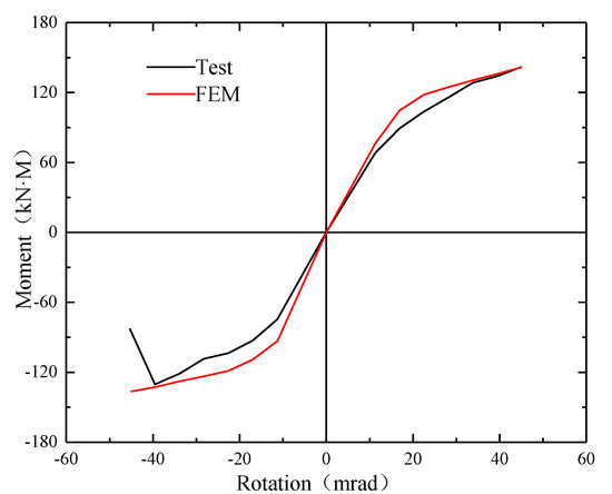 The comparison of the moment–rotation skeleton curve under cyclic load between the simulation results and the test results is shown in Figure 8. The moment–rotation hysteresis curve is shown in Figure 9.