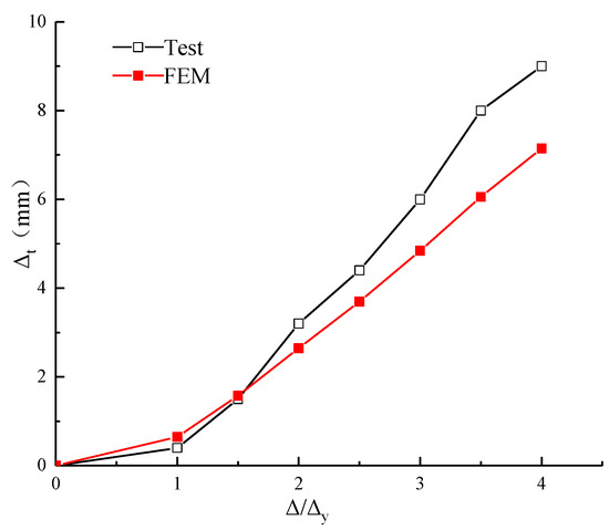 The plastic deformation of the T-stub was mainly reflected in the pulling up of the flange and the web buckling. The gap width between the flange and the wall of the column, Δt, shown in Figure 10, was recorded during the test. In the finite element analysis, this value was the difference between the displacement deformation of the corresponding point of T-stub and the displacement deformation of the wall of the column. The relevant data were extracted and compared with the data recorded during the test. The comparison figure is shown in Figure 11, where the abscissa is the load level and the ordinate is Δt [14].