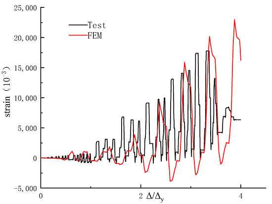 It was inevitable that some strain gauges would be damaged due to the large deformation of the components in the process of the test. Therefore, the complete data measured at the junction of the flange and the web of the T-stub (the measurement point YY3 shown in Figure 1 were selected to compare with the strain development data of the corresponding measurement points extracted through the finite element simulation results. The comparison figure is shown in Figure 12. Each stage was cycled three times after the specimen yield on the test, while each stage was cycled once in the finite element analysis.