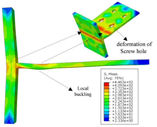 The most obvious change was the local buckling degree in the web of the T-stub with the change in web thickness. Local buckling can be clearly seen in Figure 13, while there was no obvious local buckling in the web of the T-stub in FB11 and FB13. It is worth noting that the material’s failure strength was reached in the part of the middle of the web when the thickness of the web was 7 mm, indicating that the reduction in the web thickness may have caused the fracture to occur there.