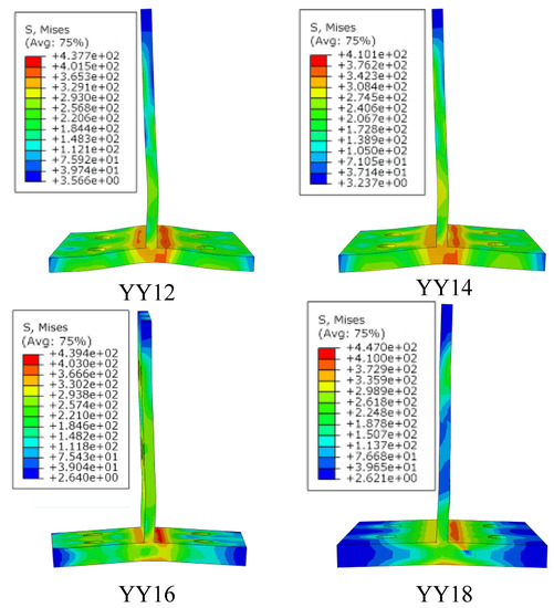 - The plastic deformation of the flange also differed in line with the increase in the flange thickness of the T-stub. The value of Δt was reduced by 15.8%, 21.7% and 35.5%, respectively, compared with the YY12 model. Figure 14 shows the plastic deformation of the T-stub in the different models.