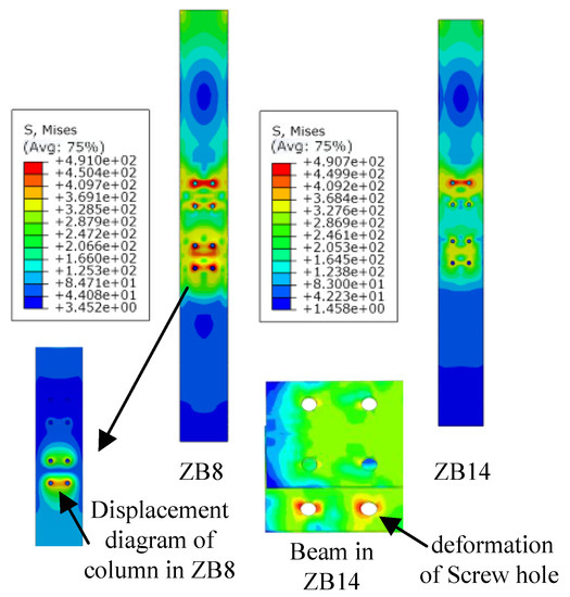 Furthermore, it can be seen from the data in Table 4 that all the indexes except the ductility coefficient and Δt increased greatly with the increase in the wall thickness of the column. Figure 15 shows the moment–rotation skeleton curve to more clearly reflect the variation in each index with the wall thickness of the column. It can be seen from Figure 15 that the increase of positive and negative ultimate bending moments gradually decreases with the increase in the wall thickness of column. Figure 16 shows the stress cloud diagram of the column in the models ZB8 and ZB14. It can be clearly seen that the stress near the screw hole decreased greatly with the increase in thickness. The cylindrical surface covered by the lower T-stub did not reach the yield stress. In Figure 16, the plumping up on the cylindrical surface covered by the T-stub in the deformation diagram of the ZB8 model was observed. This was not prominent in the other three models. The results show that the plastic deformation of the column in the composite joints decreased greatly with the increase in the wall thickness of the column, even though there was no plastic deformation in ZB14. Figure 16 also shows that the beam in ZB14 had a relatively obvious plastic deformation around the screw hole, which was not obvious in the other models.