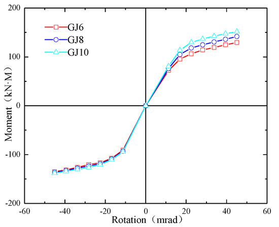 In this group of models, the load at the beam end and the mesh deformation at the joint were too large with the increase in the rebar diameter, which made the model convergence more difficult. Therefore, the calculation of the GJ12 model was not completed. Figure 17 shows the moment–rotation skeleton curves of the rebars with diameters of 6 mm, 8 mm and 10 mm. As can be seen from the figure, the rebar was one of the main stressed members under positive loading; the positive initial stiffness and ultimate bending moment capacity were greatly improved with the increase in the steel-bar diameter. However, the change in the rebar diameter had little effect on the negative initial stiffness and ultimate bending moment capacity because the concrete floor was the main compressive component under negative loading and the rebar diameter had a relatively limited effect on the overall performance.