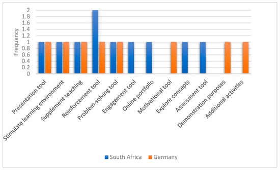 The findings showed more differences than similarities between South African and German teachers regarding their use of educational technology in mathematics education. For instance, findings show that teachers from both countries use educational technology as a presentation-, reinforcement-, supplement teaching, and problem-solving tool as well as to stimulate the learning environment. Some South African teachers used educational technology as an engagement and assessment tool, an online portfolio, and to explore concepts. On the other hand, some teachers in Germany reported using educational technology as a motivational tool, to do additional activities, and for demonstration purposes. A supporting finding emerged from Xiang [6], who found that teachers in China use technology to explain mathematical knowledge to learners and teachers from England use technology for demonstration purposes and as a problem-solving tool. The latter author further found that the teachers from China and England used educational technology, such as computers, as presentation tools to explain and justify concepts. A contrasting finding was observed in Turkey, where Birgin et al. [12] found that teachers mostly used educational technology as a communication tool rather than an instructional tool. Similarly, Umugiraneza [13] found that mathematics teachers in South Africa (KwaZulu-Natal province) mostly used computers for administration rather than for instructional purposes.