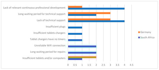 What was different is that more barriers to integrating educational technology in mathematics emerged in South Africa than in Germany. South African teachers reported additional barriers such as a lack of plugs, insufficient tablet chargers, lack of WiFi, and lack of tablet timers. Therefore, one cannot compare the differences because these barriers were absent in Germany but reported in South Africa. For instance, SAp3 described the WiFi connection as “terrible, completely dead, weak and moody”. SAp3 could also not use her laptop during the classroom observation because it was returned after some repairs were completed the day before the interview, and all the programs she normally used for teaching were deleted. Consequently, she had to resort to chalk and a blackboard. She also mentioned that her learners had to share tablets because the tablets could not charge overnight and the cage where the tablets were charged could only take 30 tablets at a time. The lack of plugs to charge the tablets was a problem because she had 39 learners in her classroom and only 30 learners could complete the weekly exercise of polygon shapes on Green Shoots (MCO) on the day of the observation due to only 30 tablets being charged; the remaining nine learners had to share tablets with other learners.