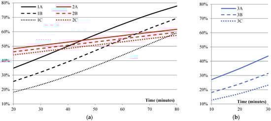 Figure 1 shows the variability in the MaaS preference probability with specification I for scenarios 1 (black line), 2 (red line), and 3 (blue line) and subscenarios A (continuous line), B (dotted line), and C (pointed line). The long-distance scenarios (1 and 2) are reported in Figure 1a while the medium-distance scenario (3) is reported in Figure 1b.